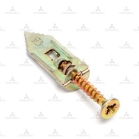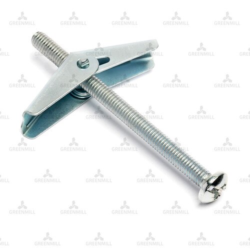An all-metal cavity fixing for use in blind cavity applications. With the bolt, the two parts (wings) of the toggle head are folded down and inserted into the hole in the base material, and then open up by means of the spring to provide a solid fixing. By tightening the screw the fixture is clamped to the base material.