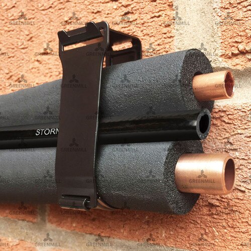 The asymmetric design provides a perfect fit for any one of four pairs of flow and return insulated refrigerant pipes. An 8mm clearance hole allows the clamp to be fixed directly to any flat surface, such as a wall or ceiling. • Corrosion-resistant BLACK zinc coating to match pipe insulation • Mounts to any flat surface, in any orientation • NEW hinged design allows for a quick install