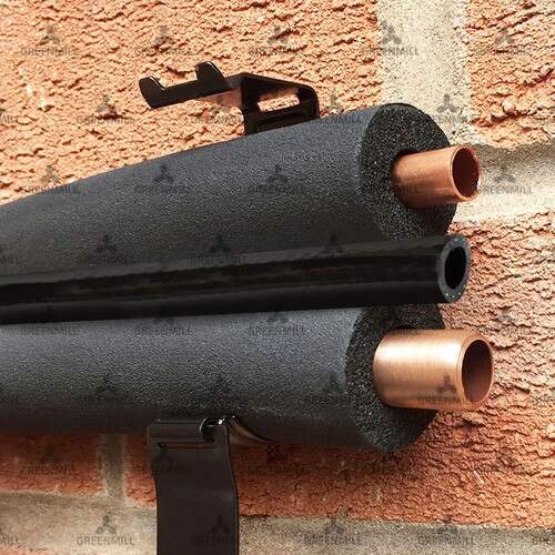 The asymmetric design provides a perfect fit for any one of four pairs of flow and return insulated refrigerant pipes. An 8mm clearance hole allows the clamp to be fixed directly to any flat surface, such as a wall or ceiling. • Corrosion-resistant BLACK zinc coating to match pipe insulation • Mounts to any flat surface, in any orientation • NEW hinged design allows for a quick install